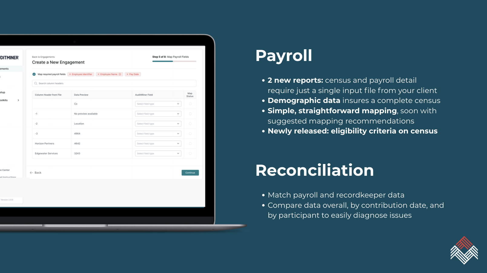 With the addition of Payroll in June of 2025 and Reconciliation in August of 2025, AuditMiner now has a comprehensive EBP Engagement suite of products to help you compile more complete and accurate data across the audit. The visual below provides a quick overview of what has been released in 2025. Keep reading for an in-depth understanding of these changes and what exactly has changed within AuditMiner's product suite.